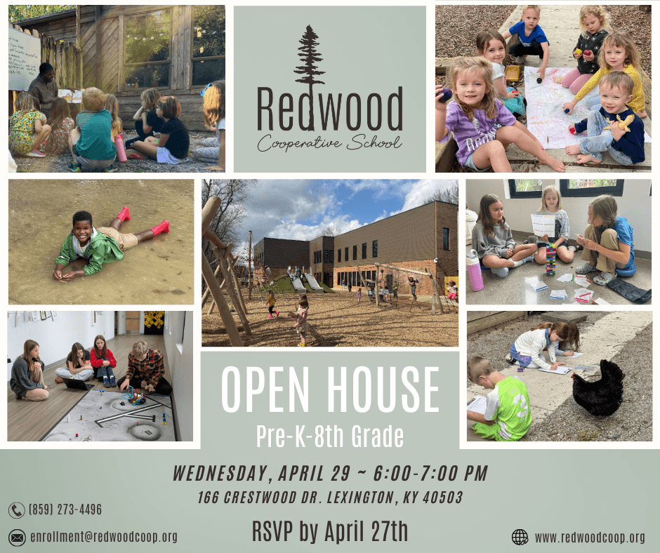 At Redwood Cooperative School, children build an educational foundation and a love of learning that will benefit them throughout their lives. Our goal is to encourage children’s creativity and curiosity through progressive, project-based learning. Through this experiential and inquiry-driven educational model, we are able to create a learning environment that nurtures each area of child development. Our classrooms invite critical and analytical thinking skills and ample opportunities to learn by doing. Our outdoor learning environment provides plenty of time to connect with nature and develop stewardship skills. During their time in our program, students will acquire knowledge and develop higher-order thinking skills as they analyze, evaluate and create while becoming problem solvers. The Redwood experience is a unique opportunity for the Lexington area and a model of progressive education for the community. We are proud to send Redwood graduates into the world as capable, kind, contributing members of society, full of integrity and compassion.